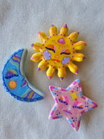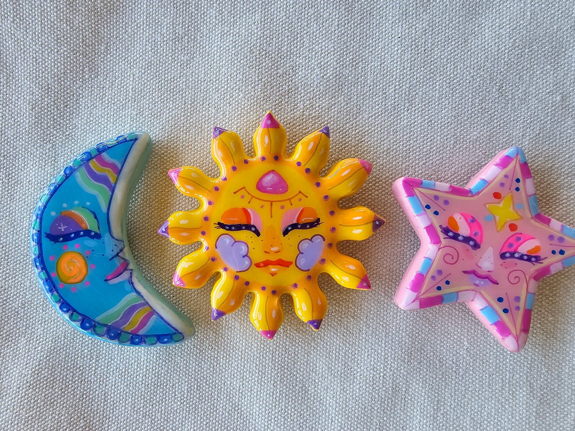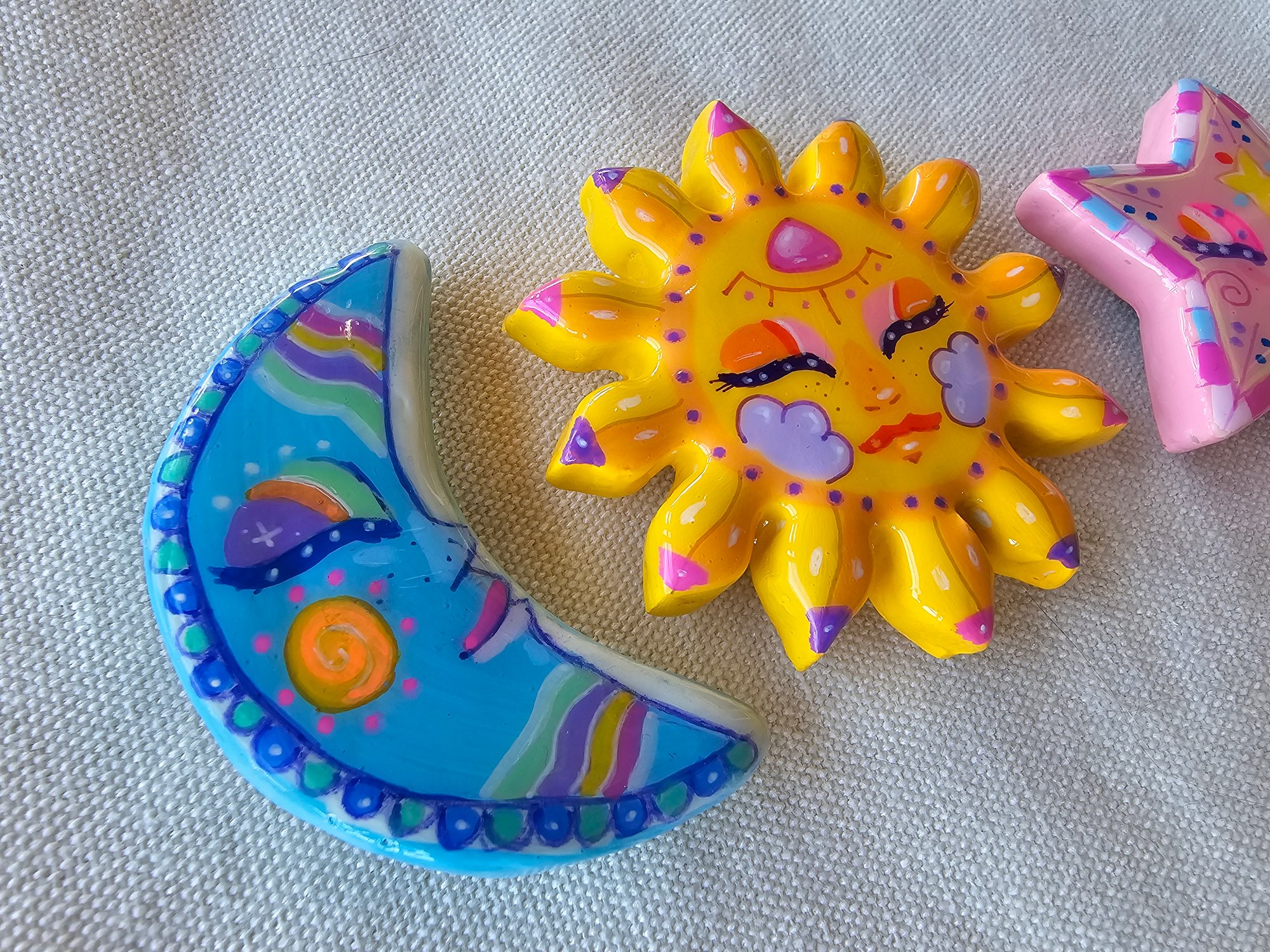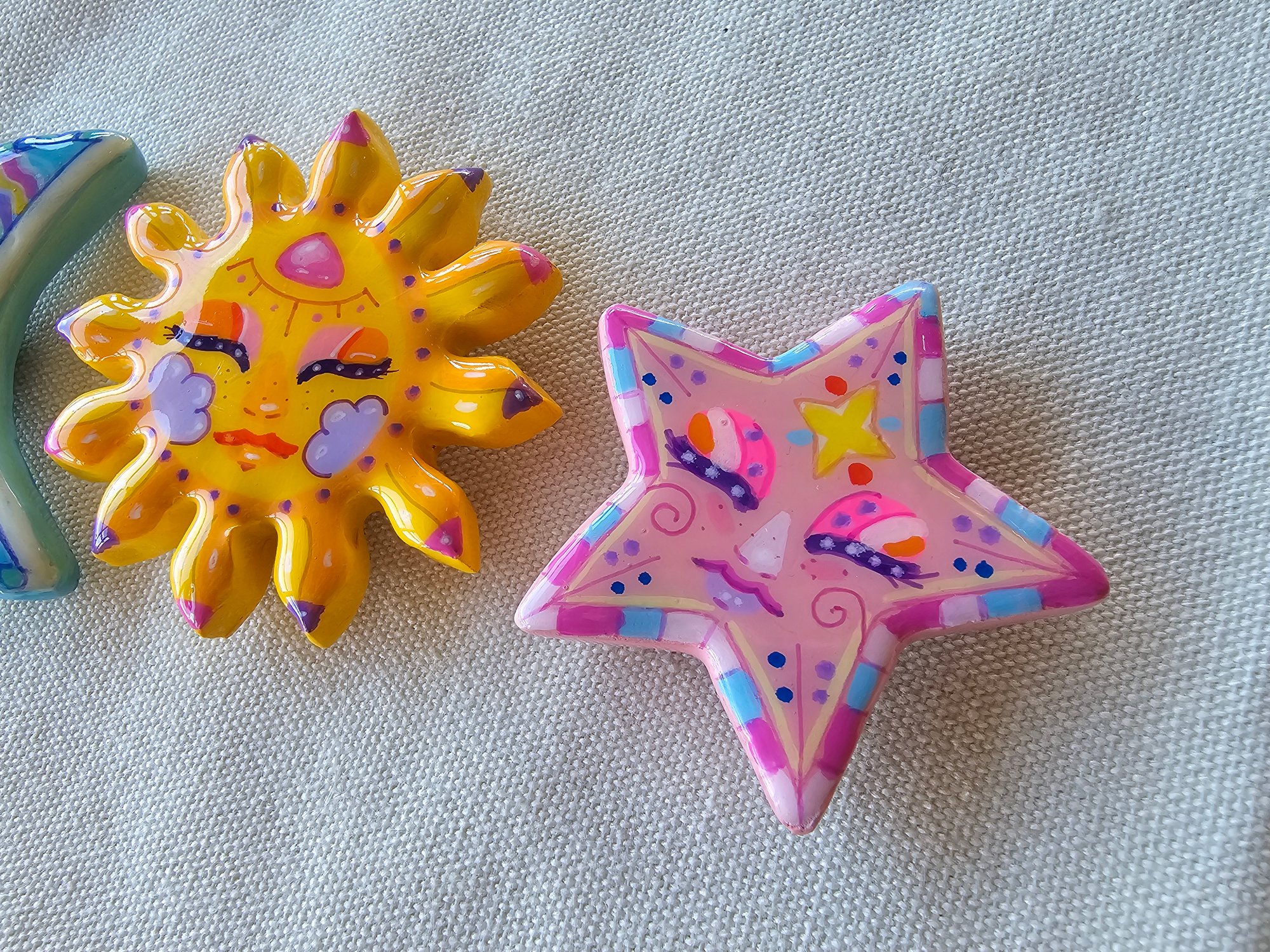 Made out of polymer clay, painted with acrylic and gouache paint. Finally finished with resin. These beautiful magnets will brighten your fridge or whiteboard calendar.